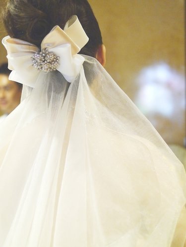 【飾品】 正面使用超閃水晶鑽項鍊耳環組;背面使用緞面水晶鑽大蝴蝶結