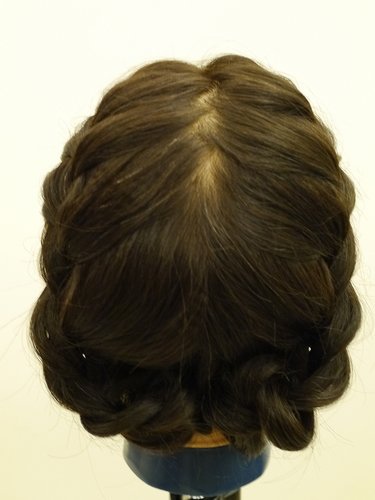 將臉側抓出一些髮絲自然垂下,把兩邊麻花辮的尾部藏進頭髮裡(皆往中心藏),並用毛夾固定住。