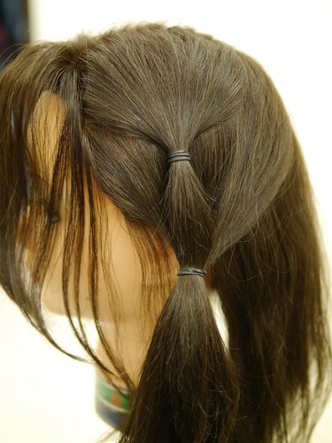 二.從單邊開始,每一小段皆用橡皮圈綁起來,依髮長約數段不等;另一邊相同方法